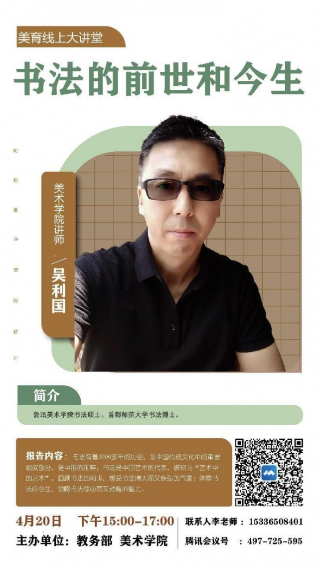 题目:书法的前世今生 演讲人:吴利国 大同大学 时间:2022年4月20日(周三) 下午3:00-5:00 腾讯会议号:497-725-595 会议密码:99350