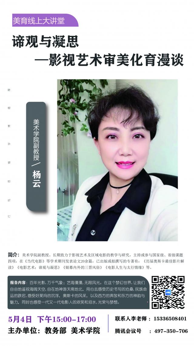 题目:谛观与凝思:影视艺术审美化育漫谈 演讲人:杨云大同大学 时间:2022年5月4日(周三) 下午3:00-5:00 腾讯会议号:497-350-706 会议密码:无