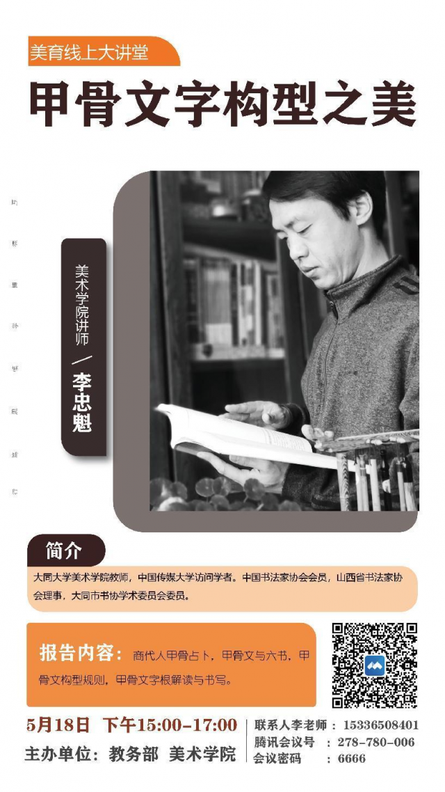 题目:甲骨文字构型之美 演讲人:李忠魁大同大学 时间:2022年5月18日(周三) 下午3:00-5:00 腾讯会议号:278-780-006 会议密码:6666