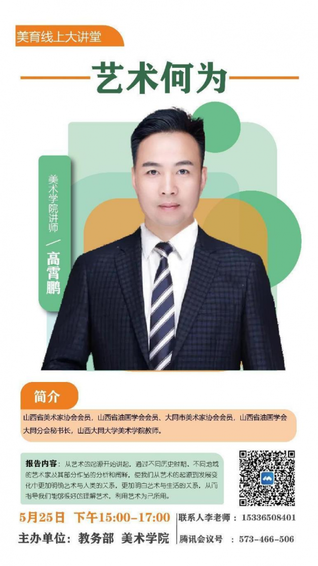 题目:艺术何为 演讲人:高霄鹏大同大学 时间:2022年5月25日(周三) 下午3:00-5:00 腾讯会议号:573-466-506 会议密码:无