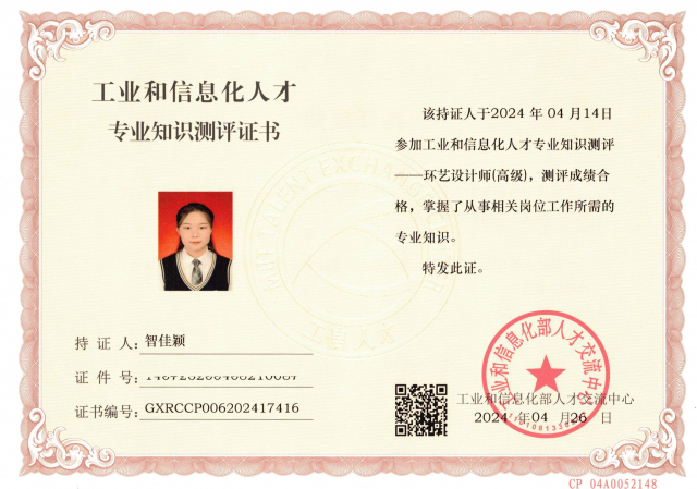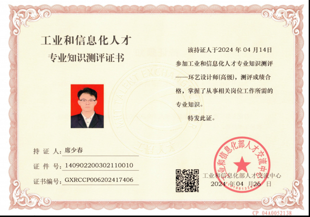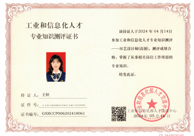近日,工业和信息化部2023-2024年度工业和信息化人才专业知识测评成绩公布,英国365公司环境设计专业席少春、智佳颖、王烜等十三名同学,参加环境艺术设计专业理论知识和设计技能两大方面的考核,以优异的综合成绩通过考核,获得工业和信息化部人才中心颁发的环艺设计师执业能力证书。
