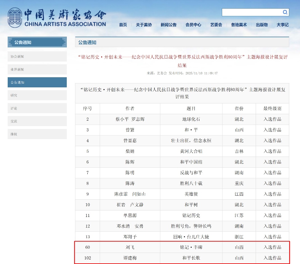 近日,中国美术家协会官网公布“铭记历史·开创未来——纪念中国人民抗日战争暨世界反法西斯战争胜利80周年”主题海报设计展复评结果,我院刘飞副教授的作品《铭记·丰碑》、谭建梅老师的作品《和平长歌》成功入选。
